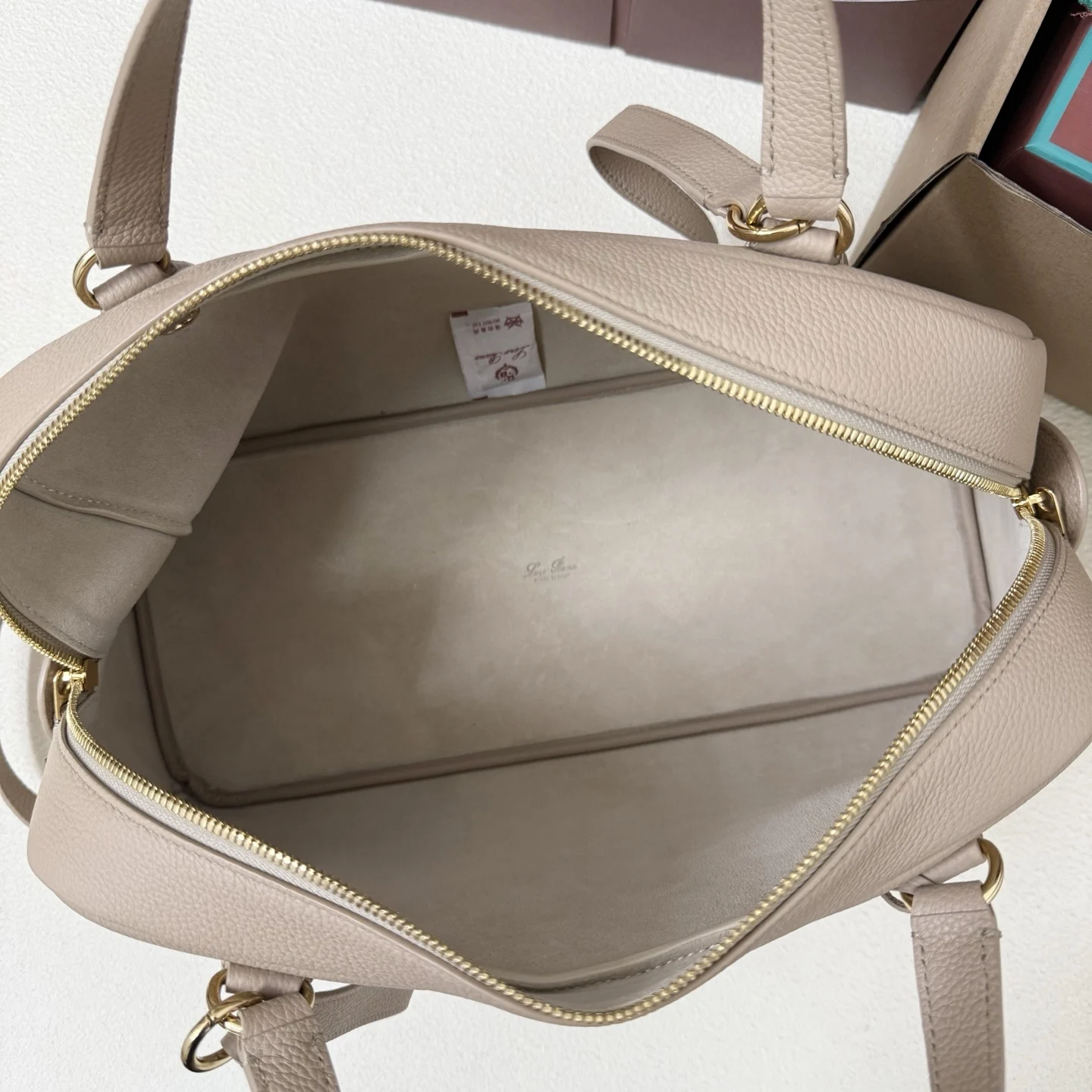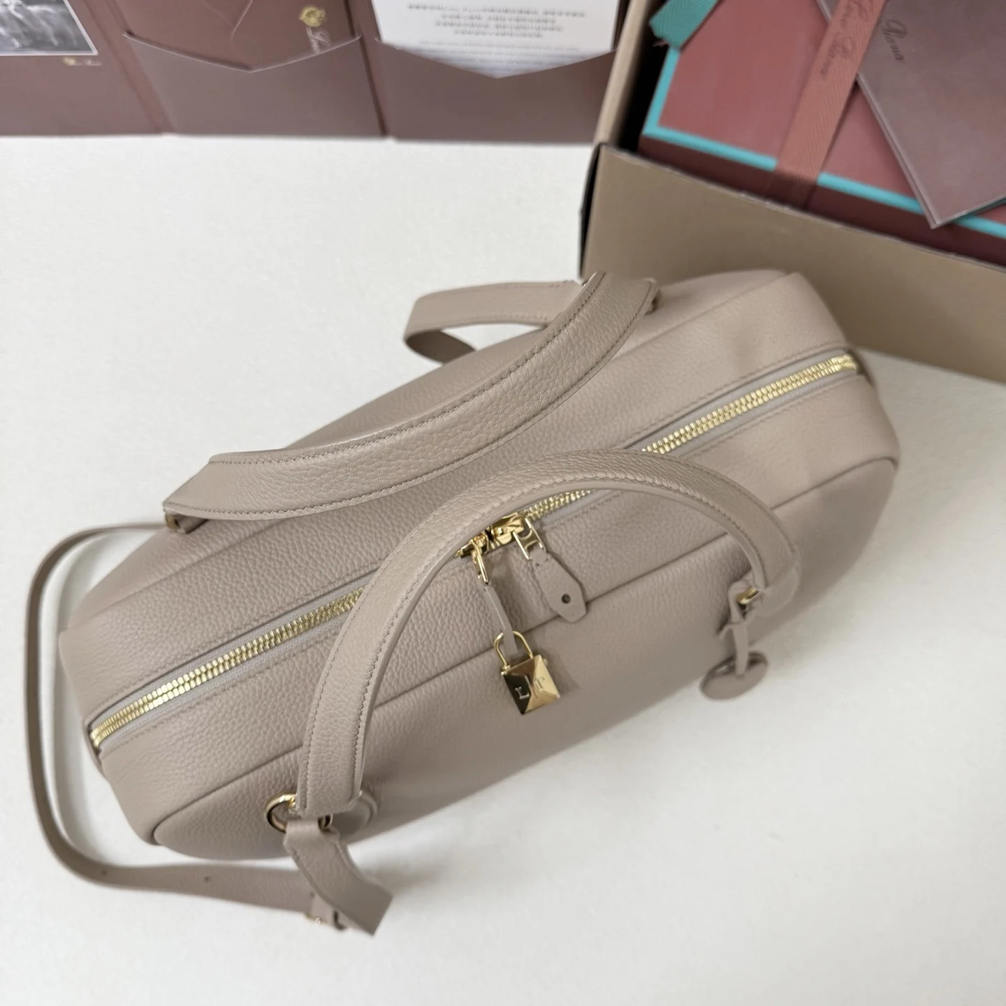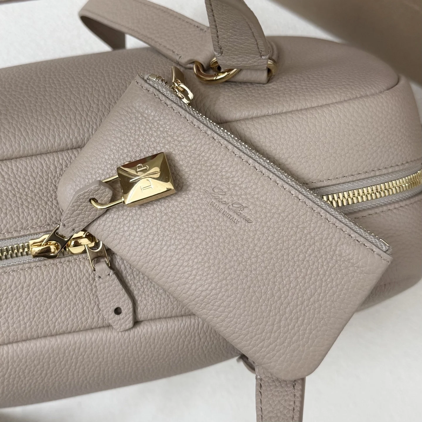Two-way zip fastening with a removable padlock, detailed with a gemstone in a Baby Cashmere hue and a Loro Piana logo