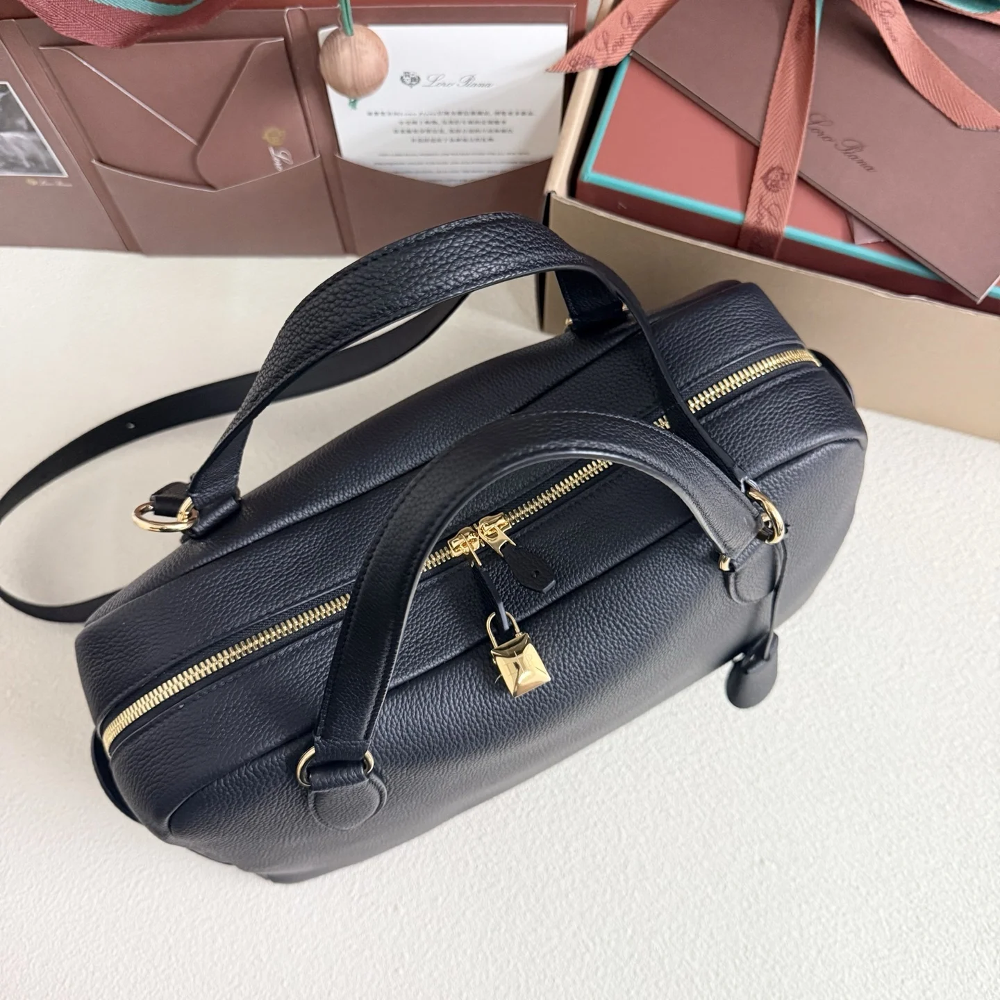 Here presented in a medium size, the Needle is a Loro Piana interpretation of the bowling bag, complete with the iconic LP charms. Evoking the Maison’s textile heritage, it is inspired by the bags used to carry knitting needles. It is constructed with soft, sinuous lines, allowing for versatile wear over the shoulder or in hand. Crafted from incredibly fine calfskin with a velvety suede lining, it has a harmonious silhouette and is made with a single piece of leather along the sides.