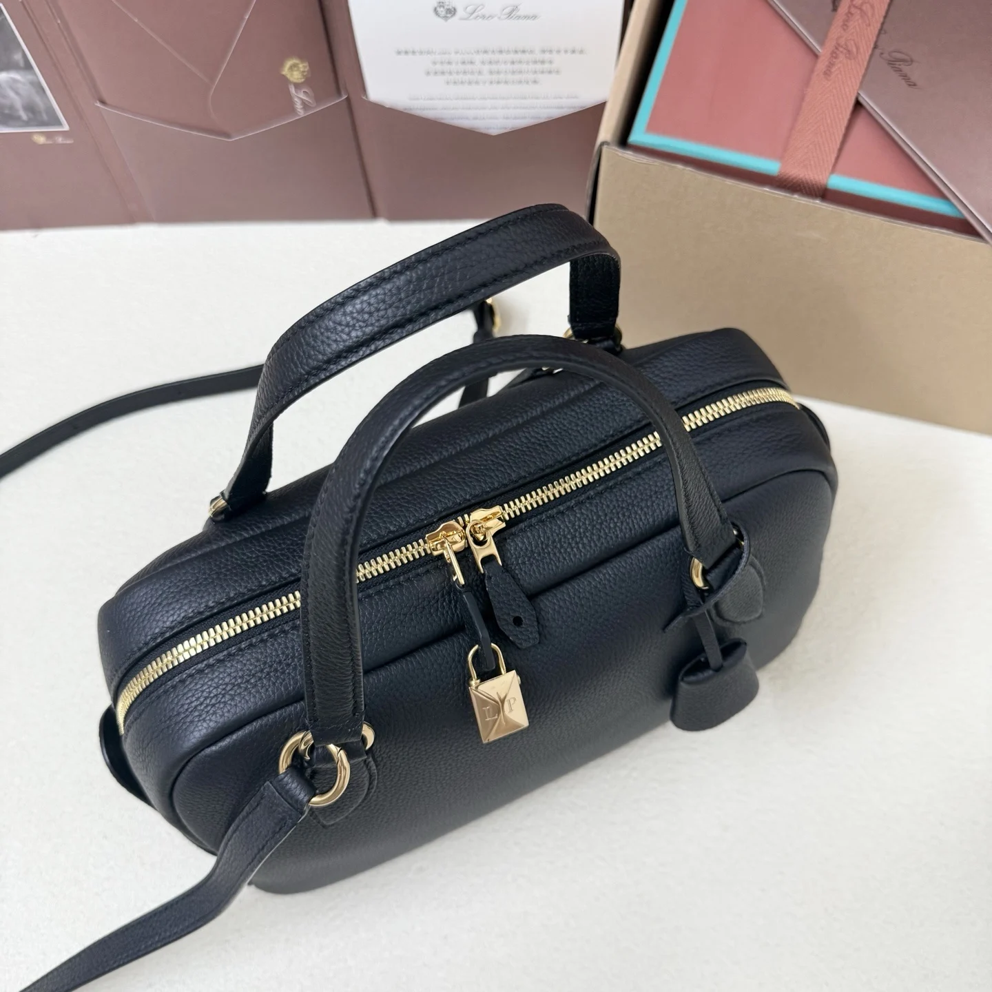 Here presented in a small size, the Needle is a Loro Piana interpretation of the bowling bag, complete with the iconic LP charms. Evoking the Maison’s textile heritage, it is inspired by the bags used to carry knitting needles. It is constructed with soft, sinuous lines, allowing for versatile wear over the shoulder or in hand. Crafted from fine-grained leather with a velvety suede lining, it has a harmonious silhouette and is made with a single piece of leather along the sides.